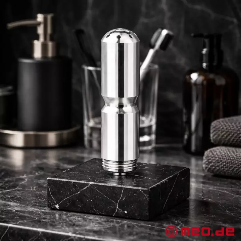 For at rense skal du forsigtigt føre brusertilbehøret ind i anus, lade vandet løbe forsigtigt ind i nogle få sekunder, holde det inde i kort tid og lade det løbe ud igen. Denne proces kan gentages flere gange, indtil det udstrømmende vand er klart. Efter brug rengøres analdouchen grundigt, f.eks. med vores VeryClean Spray, for at sikre maksimal hygiejne.