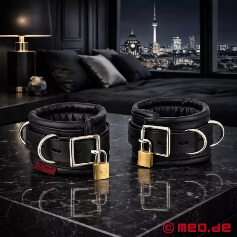 Ud over disse ankelfælder i læder omfatter Black Berlin™-serien fra MEO® også matchende håndjern og et låsbart halsbånd. Hængelåse, der låses på samme måde, muliggør ensartet håndtering af alle aflåselige bælter. Ankelhåndjernene leveres med to hængelåse, der låser på samme måde. Det er en fordel, da håndjern, ankelhåndjern og halsbånd kan låses og åbnes med kun én nøgle. Til tidsbaserede bondageopsætninger, f.eks. i Self Bondage-sammenhæng, kan en digital tidslås som MEOBond® bruges som supplerende tilbehør - afhængigt af det ønskede scenarie og den individuelle oplevelse.
