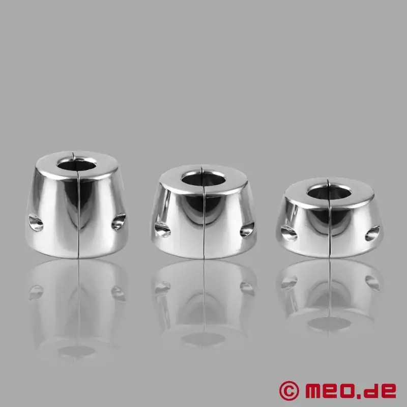 Solid, tung og designet til en tydeligt mærkbar udstrækning af pungen. BellLock™ fra MEO® er en ball stretcher i rustfrit stål med et klokkeformet design. Dens tunge vægt, ergonomiske form og todelte konstruktion af høj kvalitet skaber en intens, meget direkte trækeffekt og en usædvanlig nærværende fornemmelse.