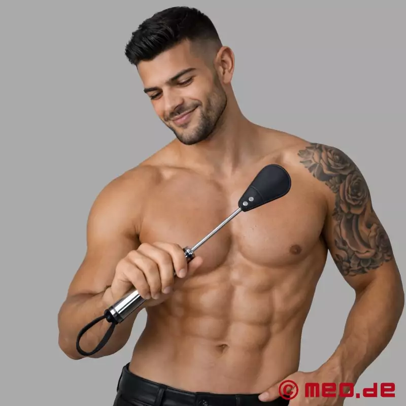 Slagfladen i læder kan bruges på begge sider. Den ene side er blødt polstret og egner sig til blid, legende stimulering. Den anden side giver mere mærkbar stimulering og er ideel, når der er brug for klar disciplin, kontrol og mere intensiv stimulering.