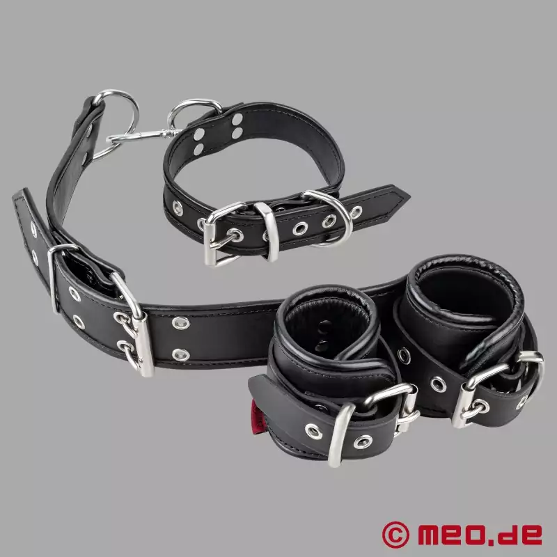 The Supreme Restraint Harness er behagelig at have på. Den består af en BDSM-krave, der er forbundet med et par håndjern i læder ved hjælp af en robust nittet, multijusterbar rygrem. Dette design giver mulighed for perfekt tilpasning til kropsstørrelsen for en optimal pasform under bondage.