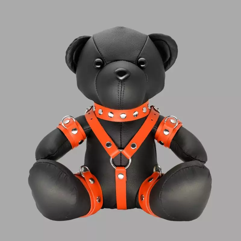 Højlydt, iøjnefaldende og kan lide at være i centrum. Orange Ollie bringer farve og energi til ethvert play room med sin klare orange. Et ægte blikfang - til alle, der fejrer deres fetish med selvtillid. Denne sorte BDSM-bamse i ægte læder er en original, sød og nuttet følgesvend, som vil få BDSM-fans' hjerter til at banke hurtigere. Bamsen er fuldt påklædt i BDSM-udstyr og er en original accessory og gave.