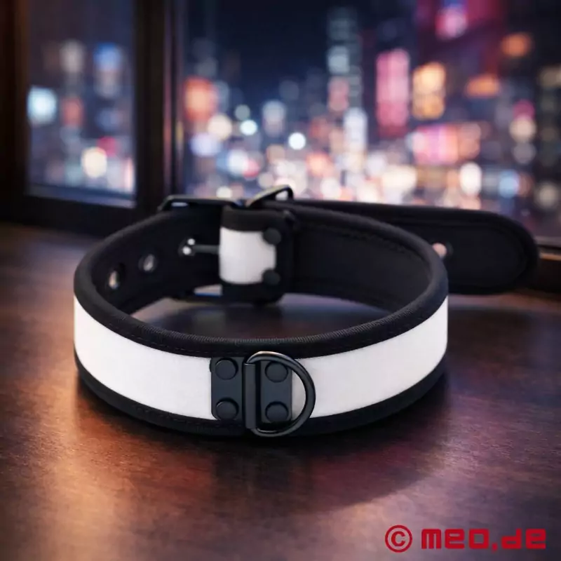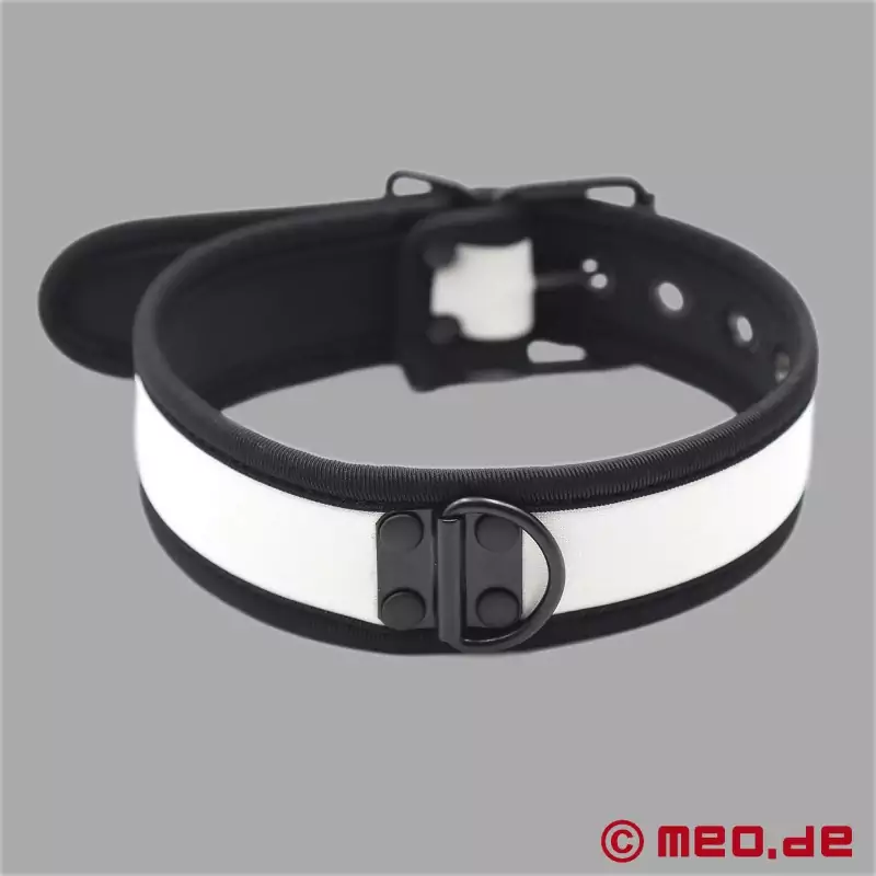 Neopren har for længst etableret sig som et praktisk og attraktivt materiale i BDSM-sektoren. Snavs, smøremidler, olier og sved kan let fjernes uden at belaste materialet unødigt. Desuden er neopren 100 % latexfrit og derfor også meget velegnet til mange allergikere. Den slanke krave fås i sort og hvid og er ideel til "menneskehvalpe" og alle BDSM-elskere, der sætter pris på et markant udseende, behagelig bærekomfort og et overbevisende forhold mellem pris og ydelse.