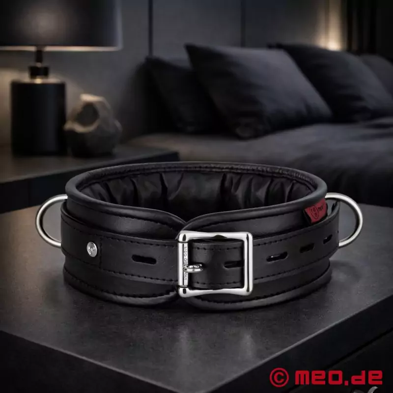 Den helt sorte BDSM-krave er lavet af stærkt okselæder og har 3 ringe til fastgørelse af bondage-tilbehør. Sub'en kan bære BDSM-kraven ubekymret over en lang periode under bondage og nyde maksimal komfort.