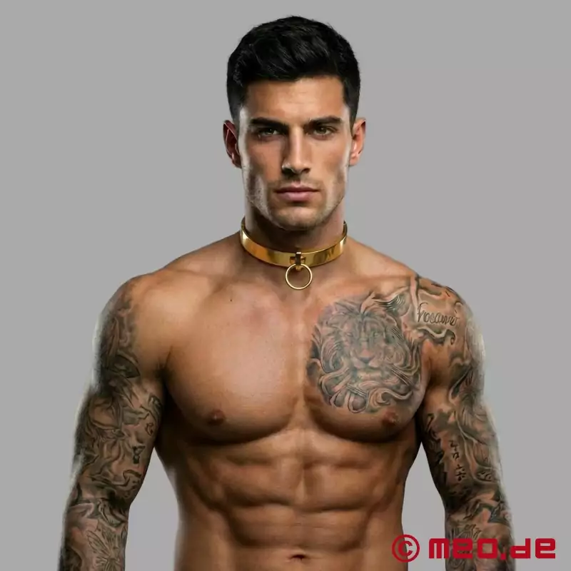 Hvis du er afhængig af guldets magi, er vores O-halsbånd det ultimative BDSM-tilbehør. Det elegante halsbånd er lavet i hånden af rustfrit stål af høj kvalitet og poleret til en spejlblank finish. Derefter påføres en gylden belægning, som gør halsbåndet til en perfekt symbiose af et restriktivt halsbånd og et fint BDSM-smykke.