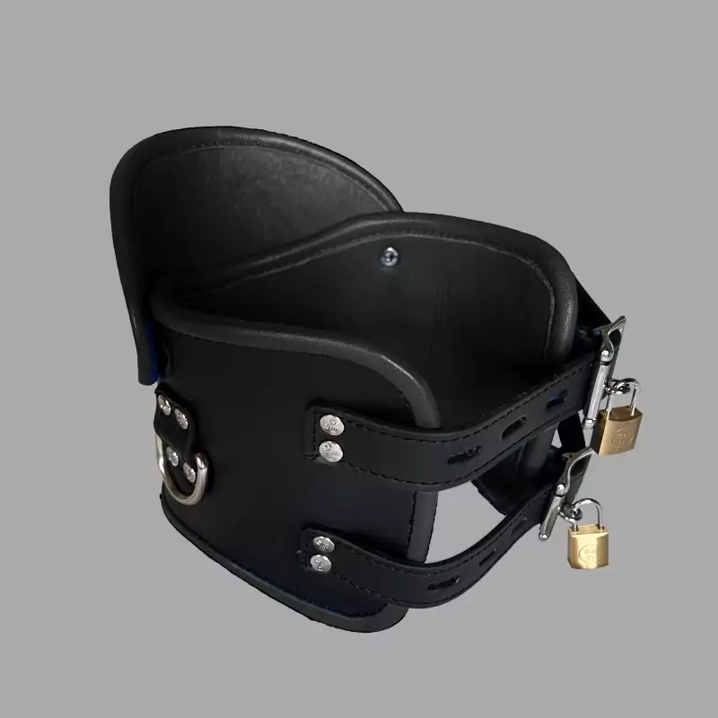 Nyd en betagende BDSM-oplevelse med vores låsbare Posture Collar i sort læder. Denne krave er højere og mere stiv end en traditionel BDSM-krave og tvinger bærerens hoved opad for at opnå en mere oprejst stilling. Den stramme pasform på Posture Collar i læder begrænser hovedets bevægelser og giver bæreren en følelse af kontrol og underkastelse. Den høje kvalitet af læder og det omhyggelige håndværk sikrer, at vores Posture Collar i læder ikke kun er funktionel, men også æstetisk tiltalende.