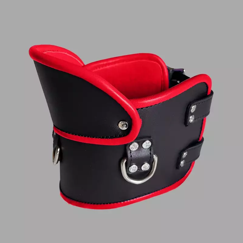 Oplev den perfekte kombination af stil og magt med vores låsbare Posture Collar af høj kvalitet i sort og rødt læder. Dette BDSM-halsbånd er håndlavet af læder i høj kvalitet og har en tæt pasform, der sikrer bærerens hoved og nakke.