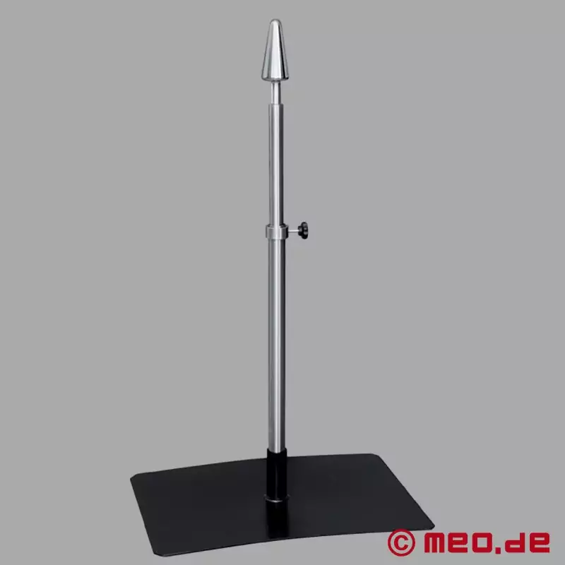 Den er enkel og effektiv at bruge: Dildostangen kan justeres trinløst til den ønskede højde (65 til 100 cm) og fastgøres sikkert på plads. Bundpladen i stål (35 x 50 cm) sikrer stabilitet og robusthed. Der er også fastgørelsesmuligheder til ankelhåndjern på bundpladen, så partneren forbliver i position, og kontrollen forbliver, hvor den hører hjemme.