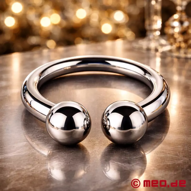 Den tunge, højglanspolerede form minder om klassiske vægtstangselementer fra piercingæstetikken og ligner samtidig et luksuriøst smykke. Uanset om det er som provokerende blikfang til et festoutfit, som symbolsk tilbehør under en BDSM-session eller bare som et stilfuldt statement - Euphoria™-armbåndet tiltrækker sig opmærksomhed.
