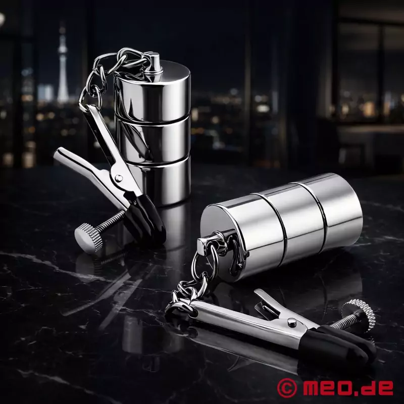 Det særlige ved dette design er de massive, variable pendulvægte. Hver klemme er udstyret med en cylindrisk vægt, hvis vægt kan justeres efter behov. Det betyder, at trækeffekten pr. klemme kan varieres individuelt - med ca. 65 g, 120 g eller 180 g. Selv små bevægelser i kroppen overføres direkte til brystvorteklemmerne, hvilket øger følelsen ved hver holdningsændring, hvert skridt og hver bevægelse.
