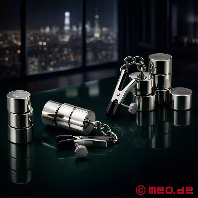 Disse brystvorteklemmer med vægt er velegnede til alle former for dominans og underkastelse. Du kan bruge dem på brystvorter, skamlæber eller pung. Gummibelægningen på klemmefladerne sikrer et sikkert greb, og trækkraften øges med hver ekstra magnetskive.