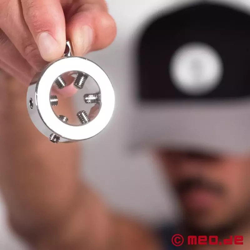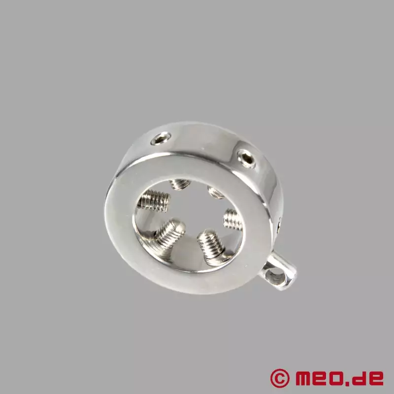 Eichelring aus Edelstahl mit verstellbaren Spikes und einschraubbarer Öse zum Anhängen von Gewichten oder mit Führungsleine. ICH LIEBE IHN .... und mein Master auch.