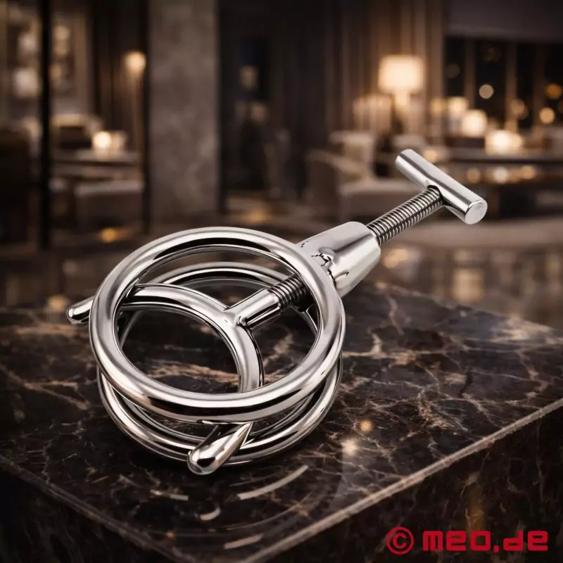 Med denne klemmeanordning, som kan justeres fra let til hård med en enkel bevægelse, kan du kontrollere trykket på penis eller kontrollen over erektionen. Den halvmåneformede trykmekanisme sikrer maksimal smerte og underkastelse - lige noget for dem, der elsker hård leg.