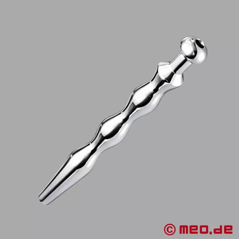 Tekniske data: Dialator. Fremstillet ved hjælp af CNC-processen. Medicinsk rustfrit stål. Gennemgående hul. Ca. 75 mm lang. Bølgeformet med 3 bølger, der stiger fra 5 mm til 8 mm. Halvkugle i den ende, der stikker ud fra glans.