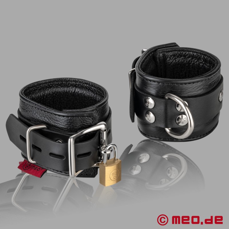 Vores stræben efter perfektion har inspireret os til at tilbyde vores mest populære lædermanchetter i en låsbar version. Lavet i enestående MEO®-kvalitet af det bedste narvede okselæder, polstret, låsbar og justerbar i størrelsen. Perfekt til lange bondage-sessioner.