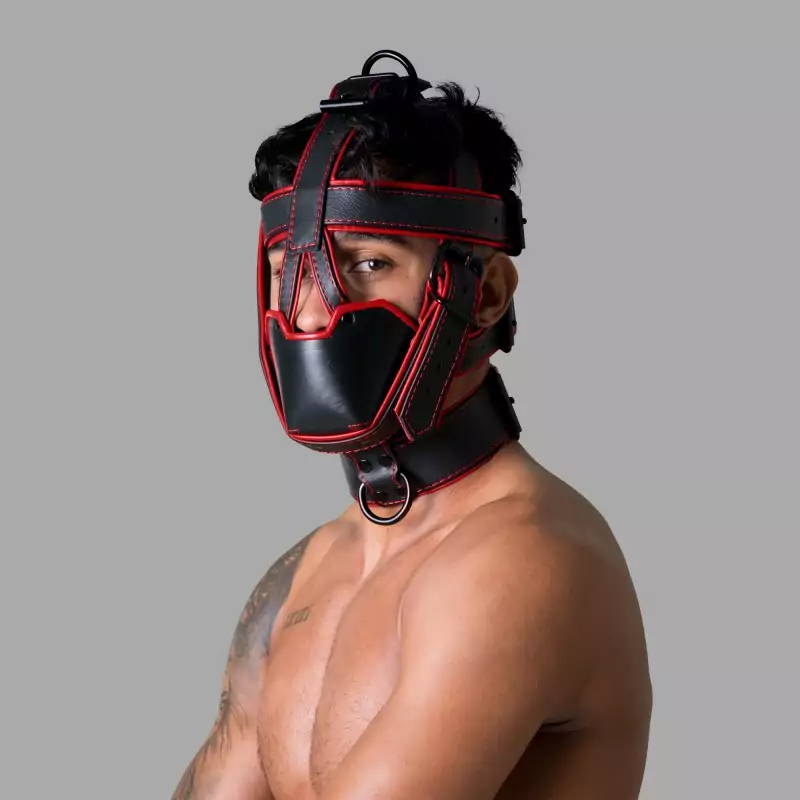 Hovedselen og den integrerede krave er udstyret med fire strategisk placerede D-ringe, der giver mange forskellige fastgørelsesmuligheder. Du kan fastgøre kæder, reb eller andet BDSM-tilbehør til disse D-ringe.