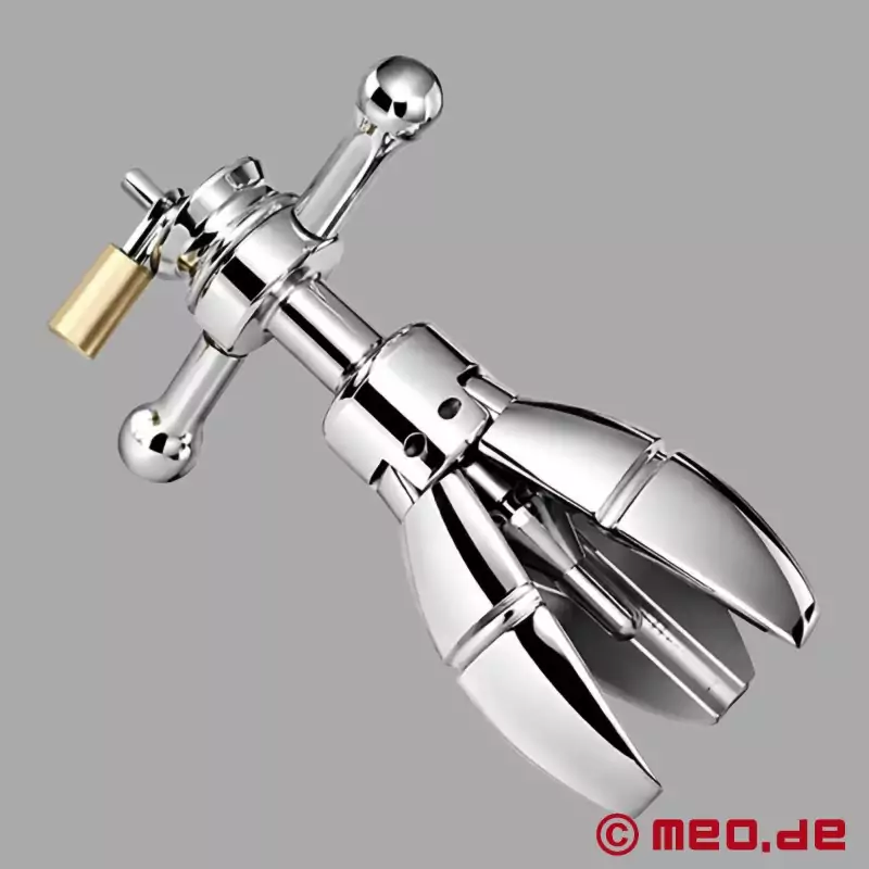 Vores låsbare buttplug kan indsættes smalt (4,50 cm), spredes til maksimalt ca. 7 cm og derefter låses. Den samlede længde af buttpluggen med lås er ca. 15 cm. Materiale på buttpluggen med lås: nikkelfrit rustfrit stål.
