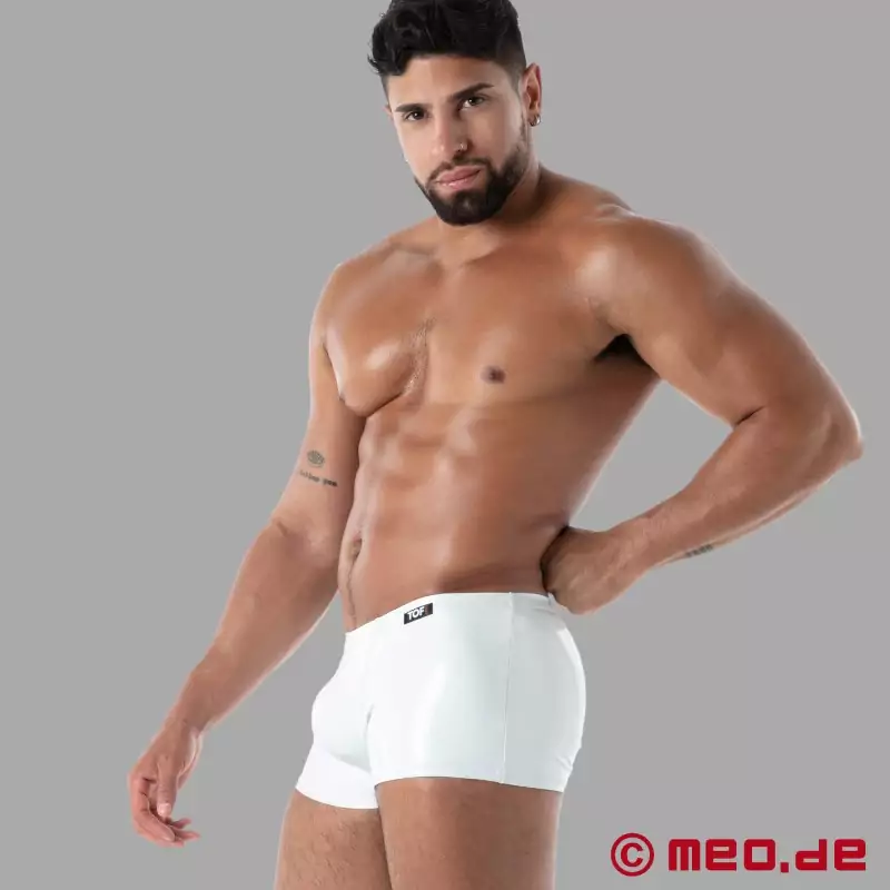 Mode eller fetish? Det er begge dele! Sexet, hudnær og i hvid er Latex Trunk fra SecondSkin™-kollektionen en vinder over hele linjen. Snittet sidder lavt som en boksershorts, fremhæver numsen og hofterne og skaber et højglanslook med maksimal blikfangseffekt. Latex-overfladen er højglans på ydersiden, mens den elastiske stofblanding på indersiden sikrer komfort og en tæt pasform. Tone-i-tone-sømme skaber en ren, meget erotisk finish. Designet og fremstillet i Paris, Frankrig.