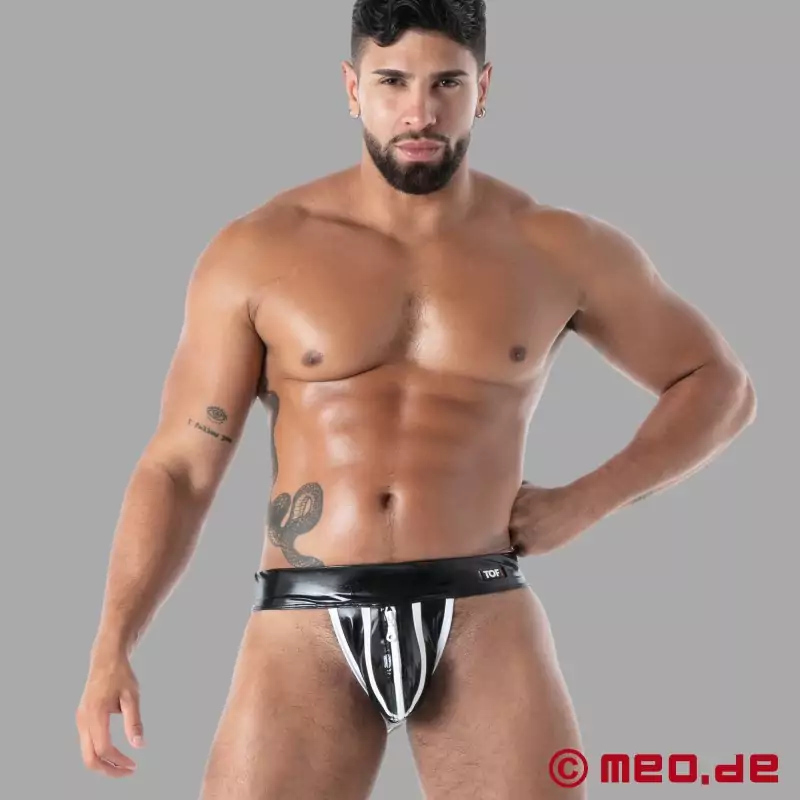 Vores Latex Zip Jock kombinerer fordelene ved et provokerende fetish-look med komforten ved en klassisk jockstrap. Alle, der kan lide det særligt afslørende, vil elske denne jockstrap i latex. Den har et perfekt anatomisk snit foran og er kompromisløst åben bagpå, hvilket garanterer maksimal effekt. Som en klassisk jockstrap lader den bagdelen være eksponeret, mens lynlåsen foran understreger det sexede look. I dyb sort ser latexen særlig kantet ud, mens de hvide kontrastlinjer tilføjer en sporty accent. Designet og fremstillet i Paris, Frankrig.