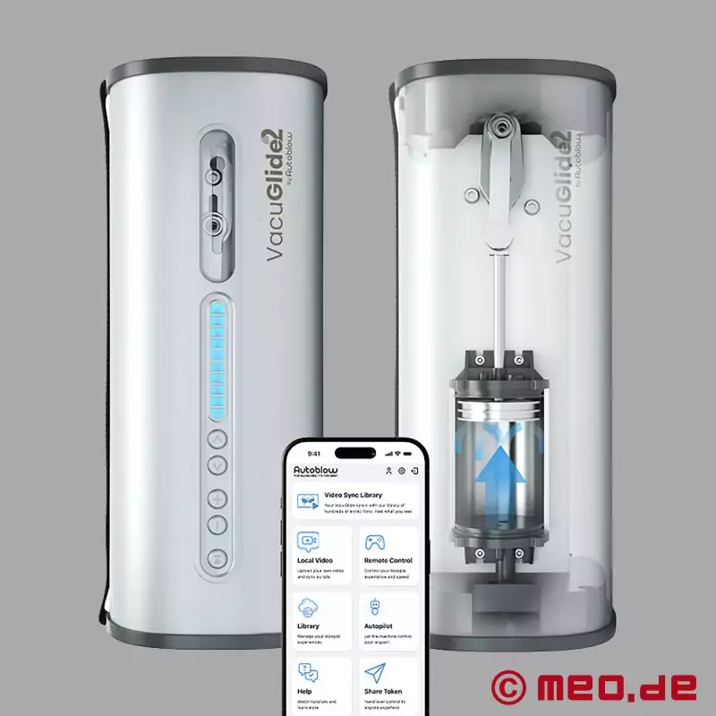 Nyt med VacuGlide 2: mere kontrol, flere programmer, flere muligheder. Den nyeste version af masturbationsmaskinen Autoblow® tilbyder 20 hastigheder (i stedet for de tidligere ti), herunder meget langsomme hastigheder med op til ti strøg pr. minut. Derudover er der ti offline-programmer, de såkaldte "Stroking Experiences", hvor cylindernes bevægelse automatisk varieres. VacuGlide 2 er WLAN-kompatibel, hvilket gør onlinefunktioner som fjernbetjening, autopilot, downloadbare tilstande og videosynkronisering tilgængelige.