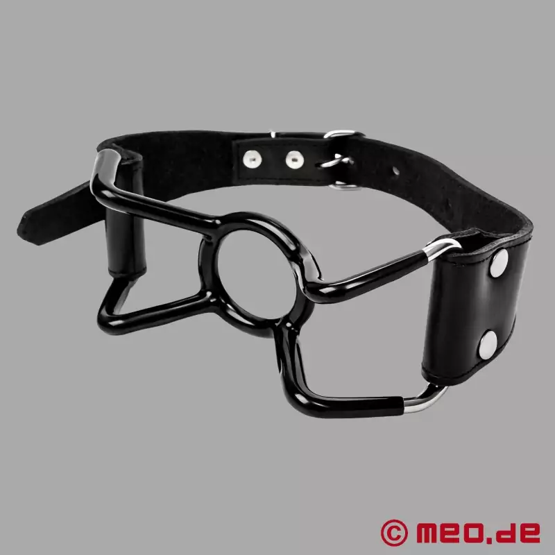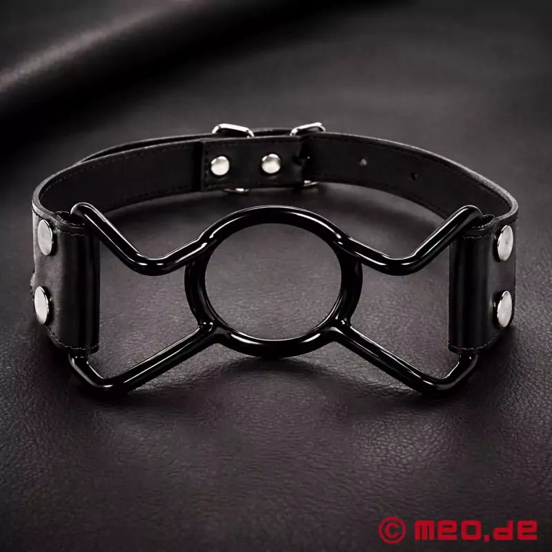 Med en diameter på 38 mm (nærmest cockring-størrelse) er der plads nok til, at du kan indføre, hvad du vil. Ringen og de fire metalstivere på siden af mundkneblen er dækket af plastik og ender i en læderstrop, som justeres til hovedets omkreds med et spænde og sikrer en sikker pasform.
