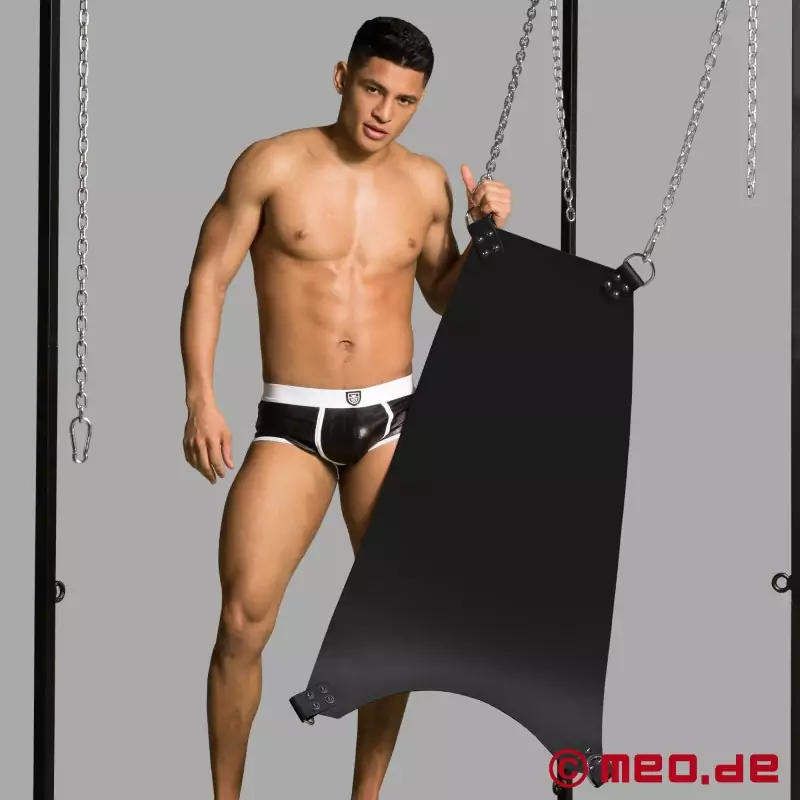 Hvis du ikke ønsker at fastgøre vores slynge til loftet i dit soveværelse, anbefaler vi vores praktiske slyngeramme. Du kan bruge vores bløde læderpude til at øge din komfort, mens du ligger ned, mens benløkker i læder eller gummi giver dig mulighed for at holde dine ben spredt i en afslappet position. Et spejl, som du kan sætte fast på toppen af slyngen, vil også være godt, da det giver dig mulighed for at observere alt ned til mindste detalje. Ud over en god fisting-creme som LETS'S FUCK og latexhandsker kan vores specielle håndjern også være en god tilføjelse. Hos MEO ® finder du også meget andet tilbehør, f.eks. kæder, et kneppestativ, en holder til handsker eller Crisco og meget mere. Vi er også vilde med de såkaldte "Fetish Pads". Disse puder er meget fugtabsorberende underlag, som er ekstremt populære i BDSM-miljøet, da de garanterer uhæmmet sjov under sex i en slynge, fordi de pålideligt absorberer alle væsker, der produceres. Vidste du forresten, at du også kan kombinere vores sling-ramme med vores doggy style fuck bench eller vores sling board?