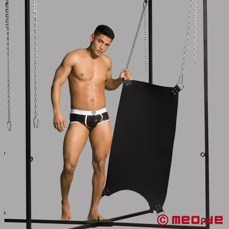 Hvis du ikke ønsker at fastgøre vores slynge til loftet i dit soveværelse, anbefaler vi vores praktiske slyngeramme. Du kan bruge vores bløde læderpude til at øge din komfort, mens du ligger ned, mens benløkker i læder eller gummi giver dig mulighed for at holde dine ben spredt i en afslappet position. Et spejl, som du kan sætte fast på toppen af slyngen, vil også være godt, da det giver dig mulighed for at observere alt ned til mindste detalje. Ud over en god fisting-creme som LETS'S FUCK og latexhandsker kan vores specielle håndjern også være en god tilføjelse. Hos MEO ® finder du også meget andet tilbehør, f.eks. kæder, et stativ til kneppemaskinen, en holder til handsker eller Crisco og meget mere. Vi er også vilde med de såkaldte "Fetish Pads". Disse puder er meget fugtabsorberende underlag, som er ekstremt populære i BDSM-miljøet, da de garanterer uhæmmet sjov under sex i en slynge, fordi de pålideligt absorberer alle væsker, der produceres. Vidste du forresten, at du også kan kombinere vores sling-ramme med vores doggy style fuck bench eller vores sling board?