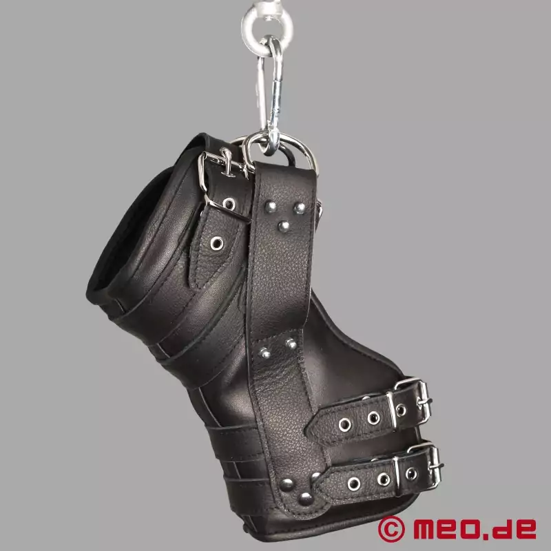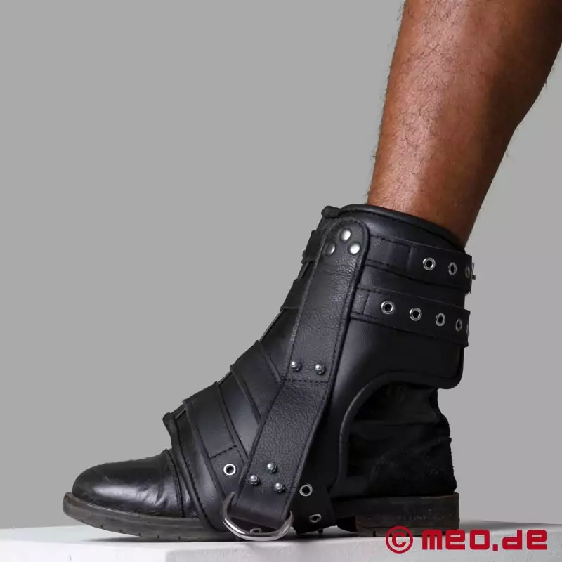 Ankelhåndjern, der bruges til at hænge nogen op i fødderne under suspension bondage, skal ikke kun være komfortable, men også særligt sikre. Vores fodremme opfylder begge disse krav til fulde. Massivt okselæder, dobbelt syet og også sikret med nitter.