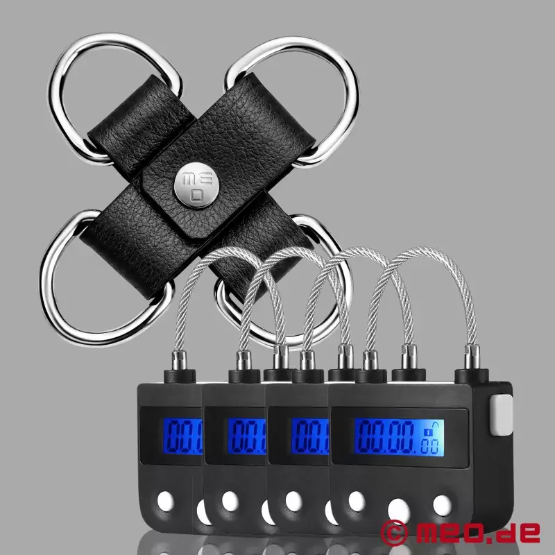 Sættet består af: 4 MEOBOND bondage-tidslåse og et låsbart hogie-sæt til at forbinde ankelhåndjern og ankelmanchetter.