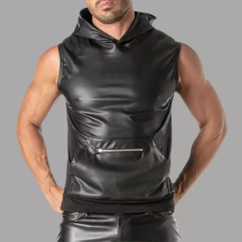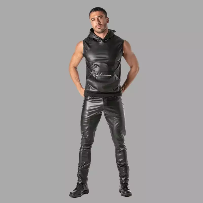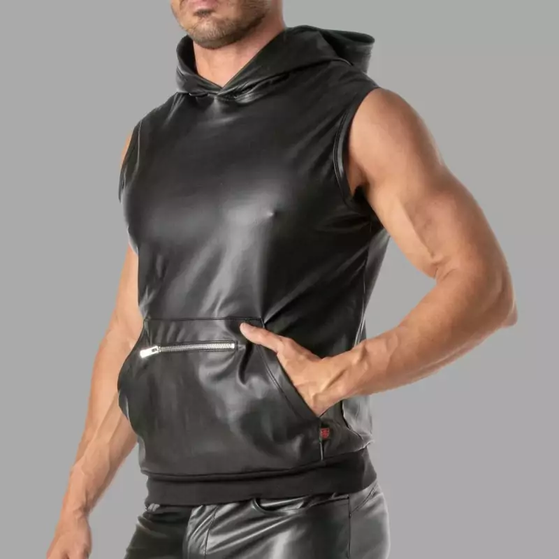 Ærmeløs hættetrøje i et fantastisk kunstlæderdesign med en stor lynlåslomme og en linning i den typiske franske Terry-stil. Hættetrøjen er designet i samarbejde med TOF Paris og MEO og kombinerer et maskulint look med et strejf af fransk raffinement og praktisk funktionalitet: